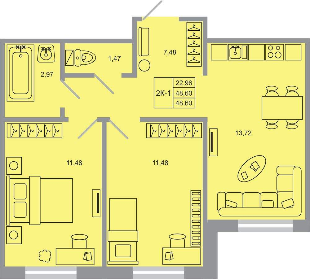 Жилая площадь 22.96 м2, кухня 13.72 м2, чистовая отделка, комнаты изолированные.