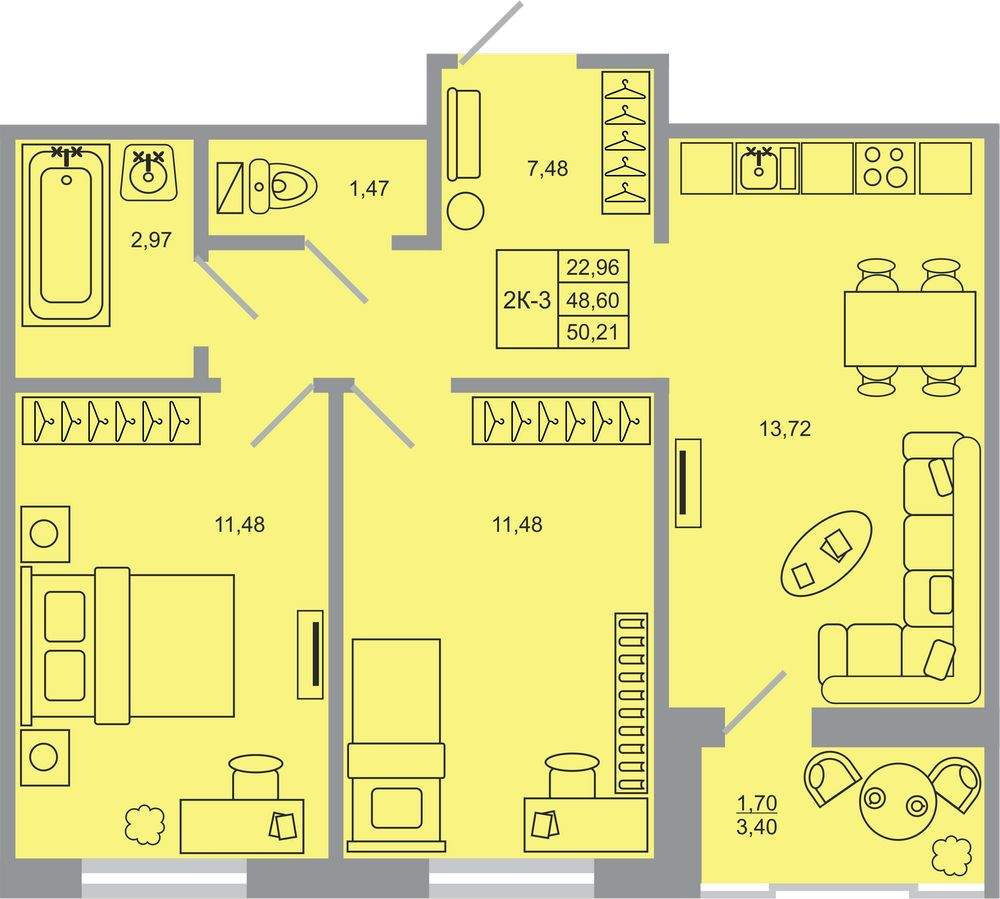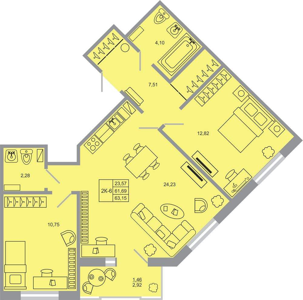 Жилая площадь 24.44 м2, кухня 13.57 м2, чистовая отделка, комнаты изолированные, балконов - 1.